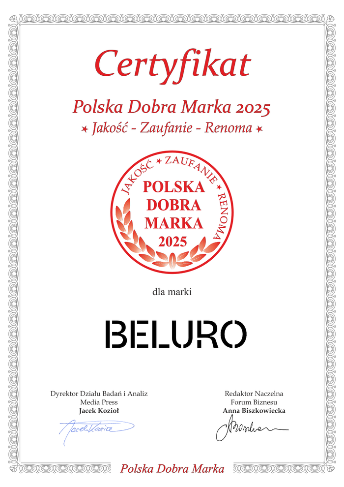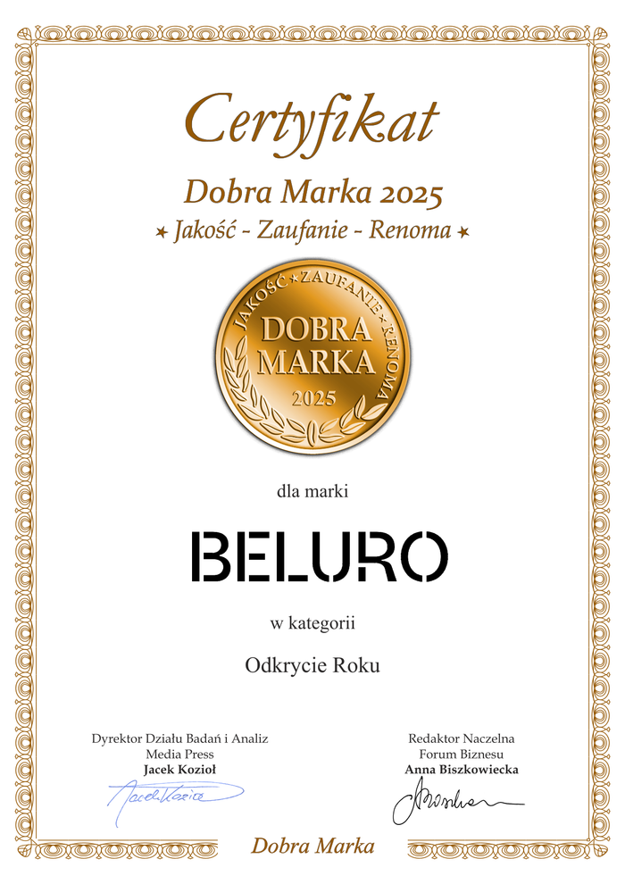 Otrzymanie dla BELURO tytułów Dobra Marka 2025– Jakość, Zaufanie, Renoma w kategorii Odkrycie Roku oraz Polska Dobra Marka 2025 – Jakość, Zaufanie, Renoma to dla nas ogromny zaszczyt i motywacja do dalszego rozwoju.