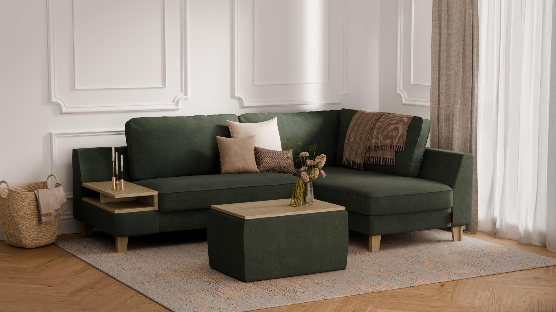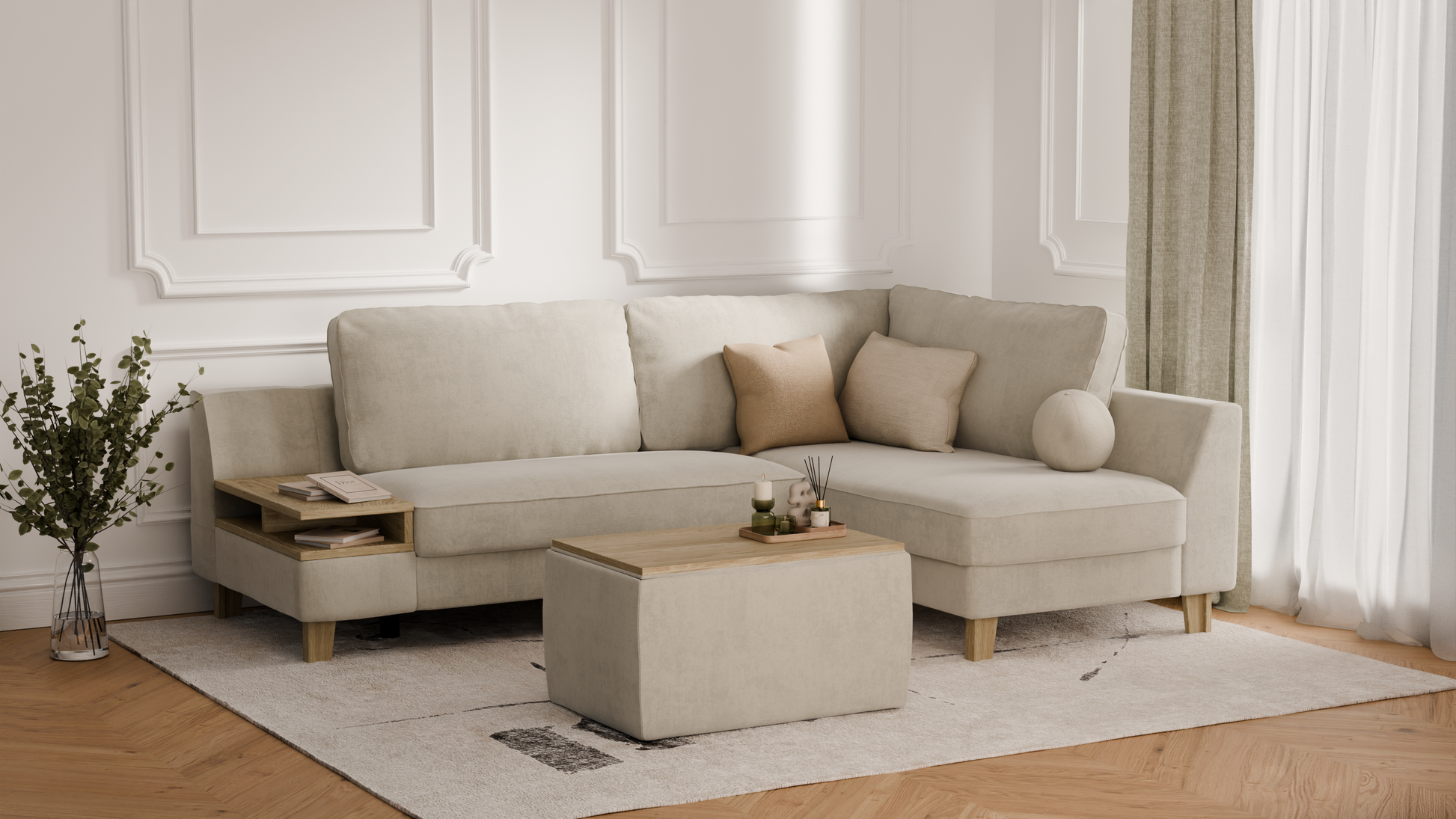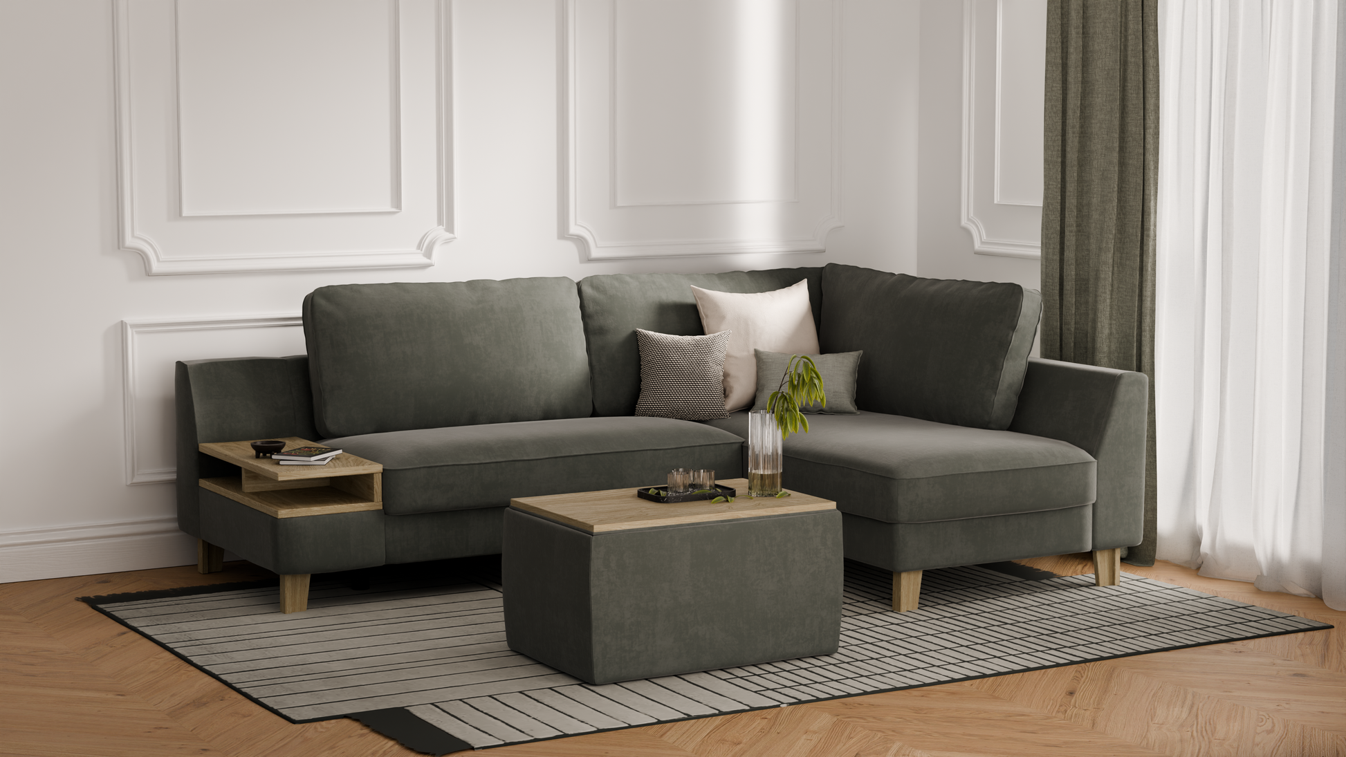 Elegancki zestaw wypoczynkowy do salonu – to propozycja, która łączy w sobie komfort codziennego użytkowania, nowoczesny styl oraz praktyczną funkcjonalność. W skład kompletu wchodzi elegancki narożnik o długości 245 cm, zapewniający dużo miejsca do odpoczynku i spotkań w gronie najbliższych, a także duża pufa z pojemnym schowkiem, idealna jako dodatkowe siedzisko, podnóżek lub miejsce do przechowywania. Dzięki temu zestawowi urządzisz salon w sposób wygodny i estetyczny, tworząc przestrzeń sprzyjającą relaksowi i eleganckiej aranżacji wnętrza.