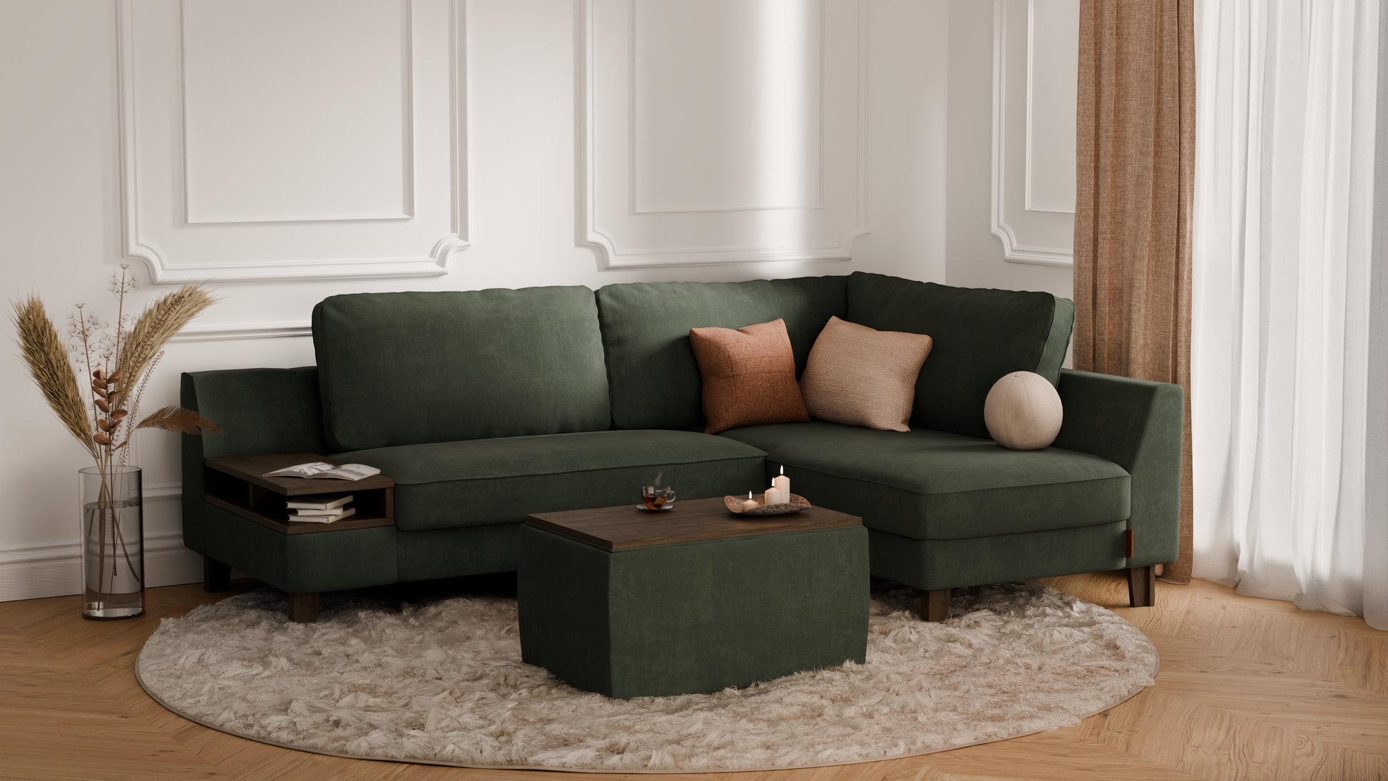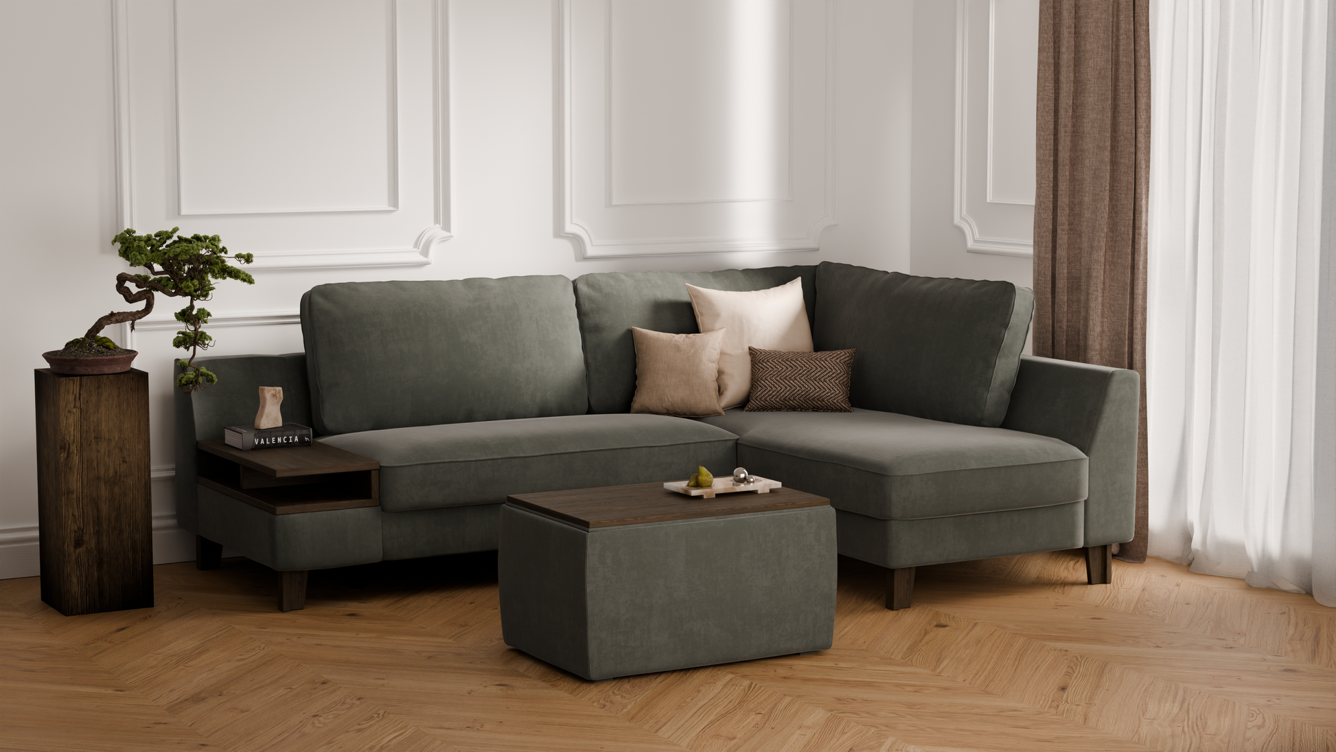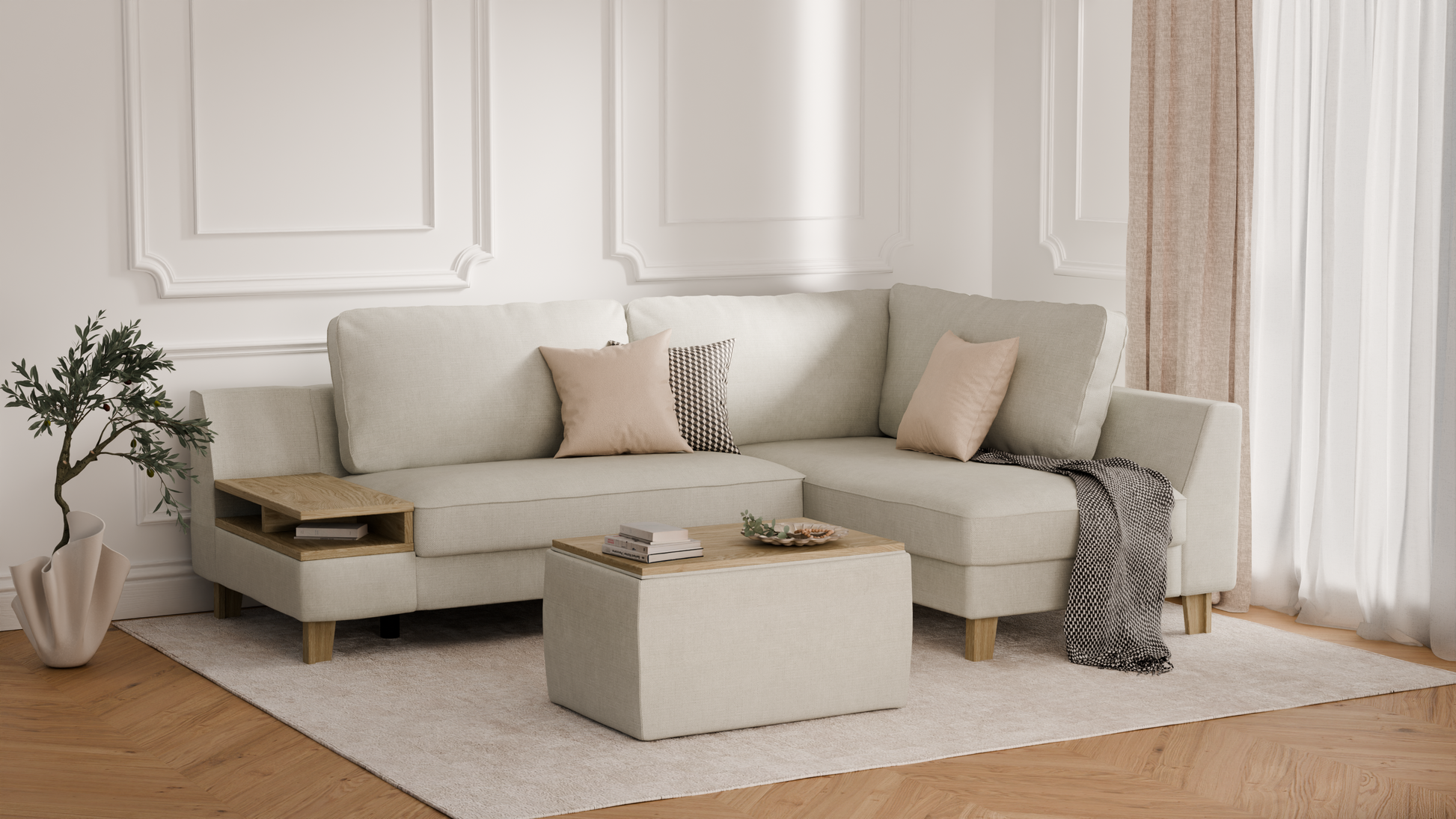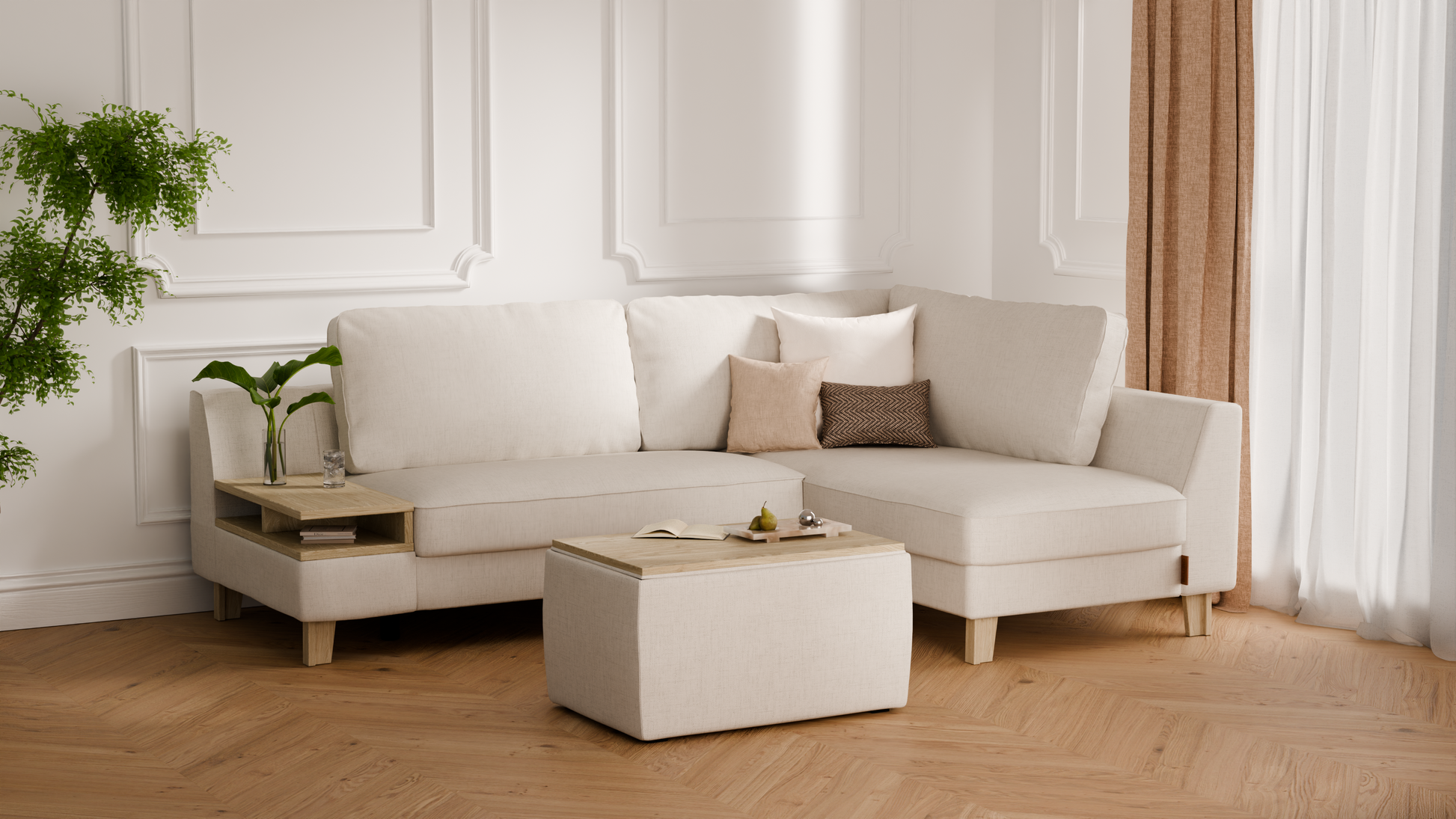 Elegancki zestaw wypoczynkowy do salonu – to propozycja, która łączy w sobie komfort codziennego użytkowania, nowoczesny styl oraz praktyczną funkcjonalność. W skład kompletu wchodzi elegancki narożnik o długości 245 cm, zapewniający dużo miejsca do odpoczynku i spotkań w gronie najbliższych, a także duża pufa z pojemnym schowkiem, idealna jako dodatkowe siedzisko, podnóżek lub miejsce do przechowywania. Dzięki temu zestawowi urządzisz salon w sposób wygodny i estetyczny, tworząc przestrzeń sprzyjającą relaksowi i eleganckiej aranżacji wnętrza.