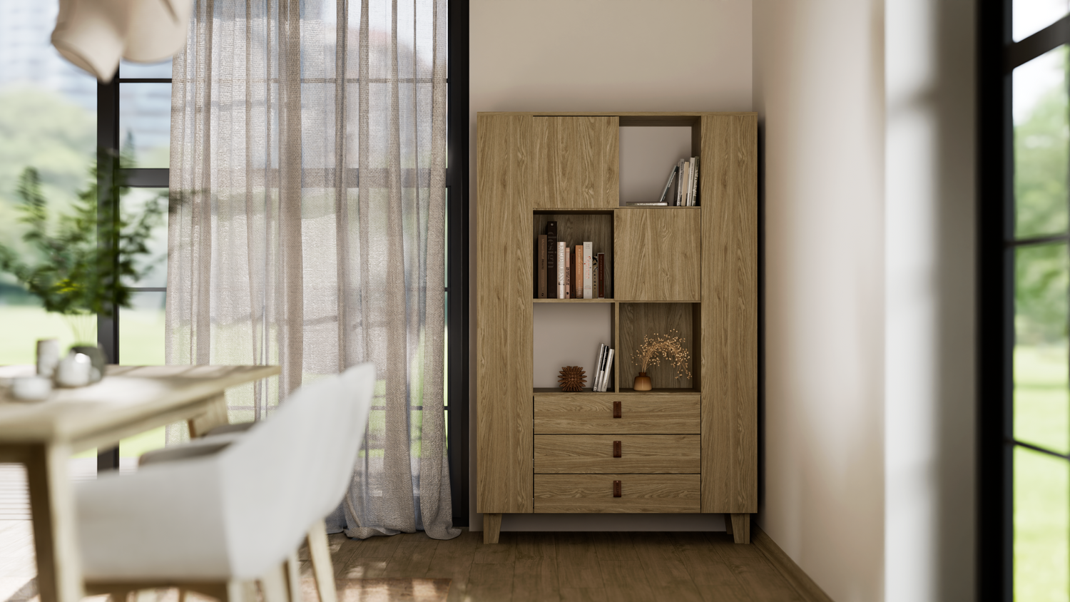 Wysoka komoda dostępna jest w dwóch eleganckich wybarwieniach: dąb olejowany – ciepły i naturalny, oraz ciemny dąb – stylowy i wyrazisty. Obie wersje świetnie wpisują się w nowoczesne i klasyczne aranżacje wnętrz. To mebel, który nie tylko porządkuje przestrzeń, ale też nadaje jej charakter. Sprawdzi się zarówno jako praktyczna komoda, jak i nowoczesny regał do ekspozycji ulubionych przedmiotów.