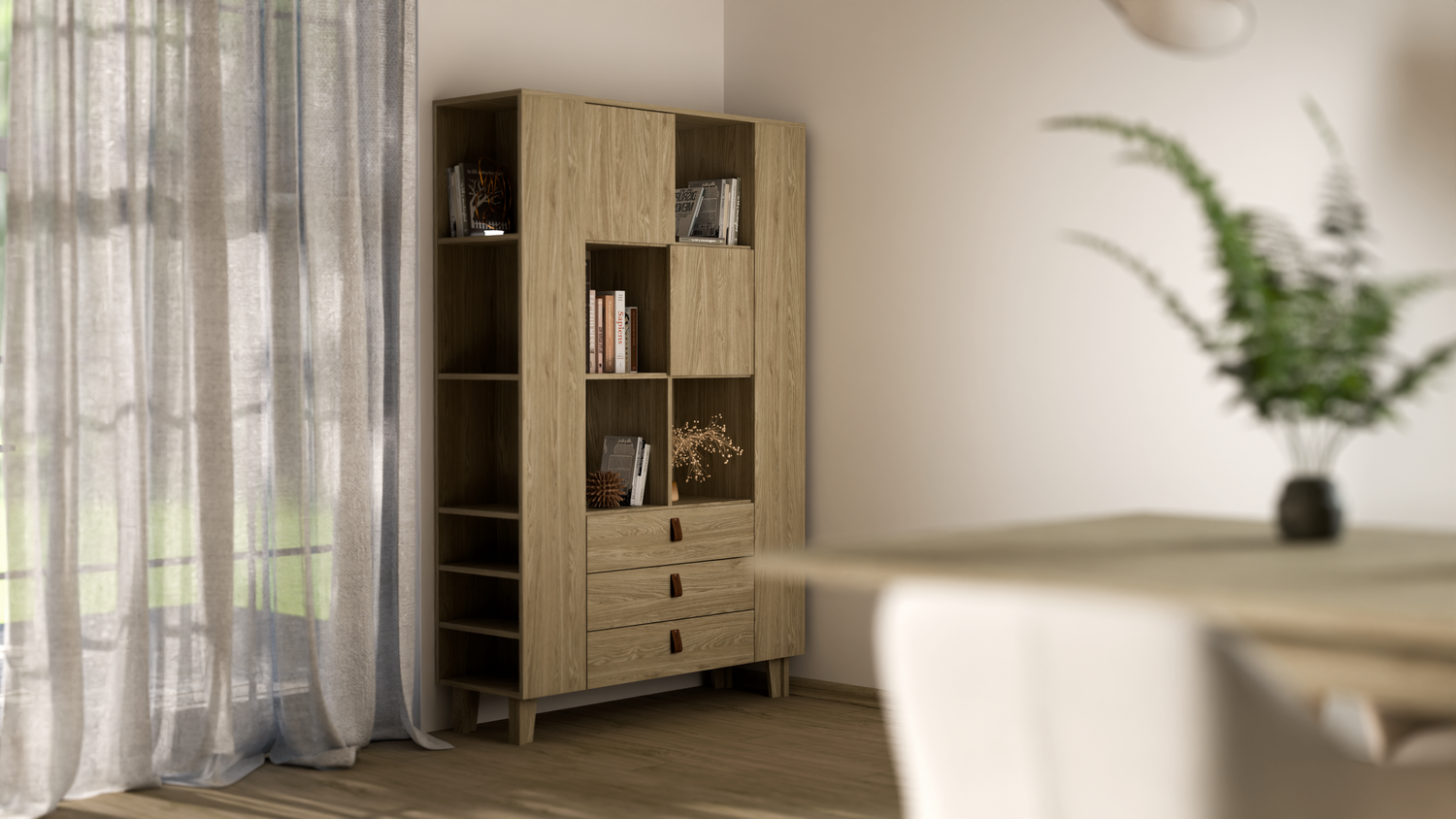 Komoda wyposażona jest w trzy pojemne szuflady z przodu — idealne na dokumenty, tekstylia czy drobne akcesoria. Skórzane uchwyty dodają całości nowoczesnego, a zarazem przytulnego charakteru. Dwie szafki z drzwiczkami pozwalają schować to, co chcesz ukryć, a cztery otwarte wnęki w formie regału świetnie nadają się na książki, dekoracje czy pamiątki. Dodatkowe półki po bokach zwiększają funkcjonalność mebla i pozwalają lepiej zorganizować przestrzeń.