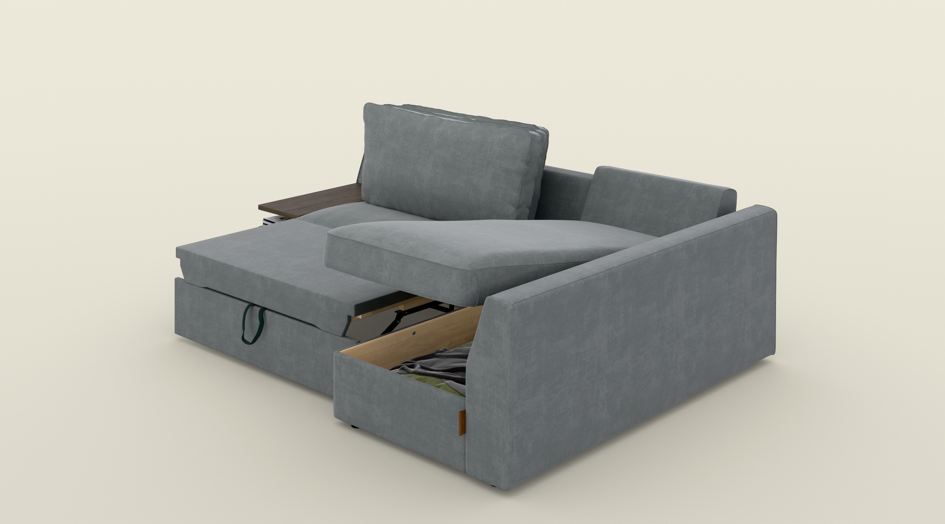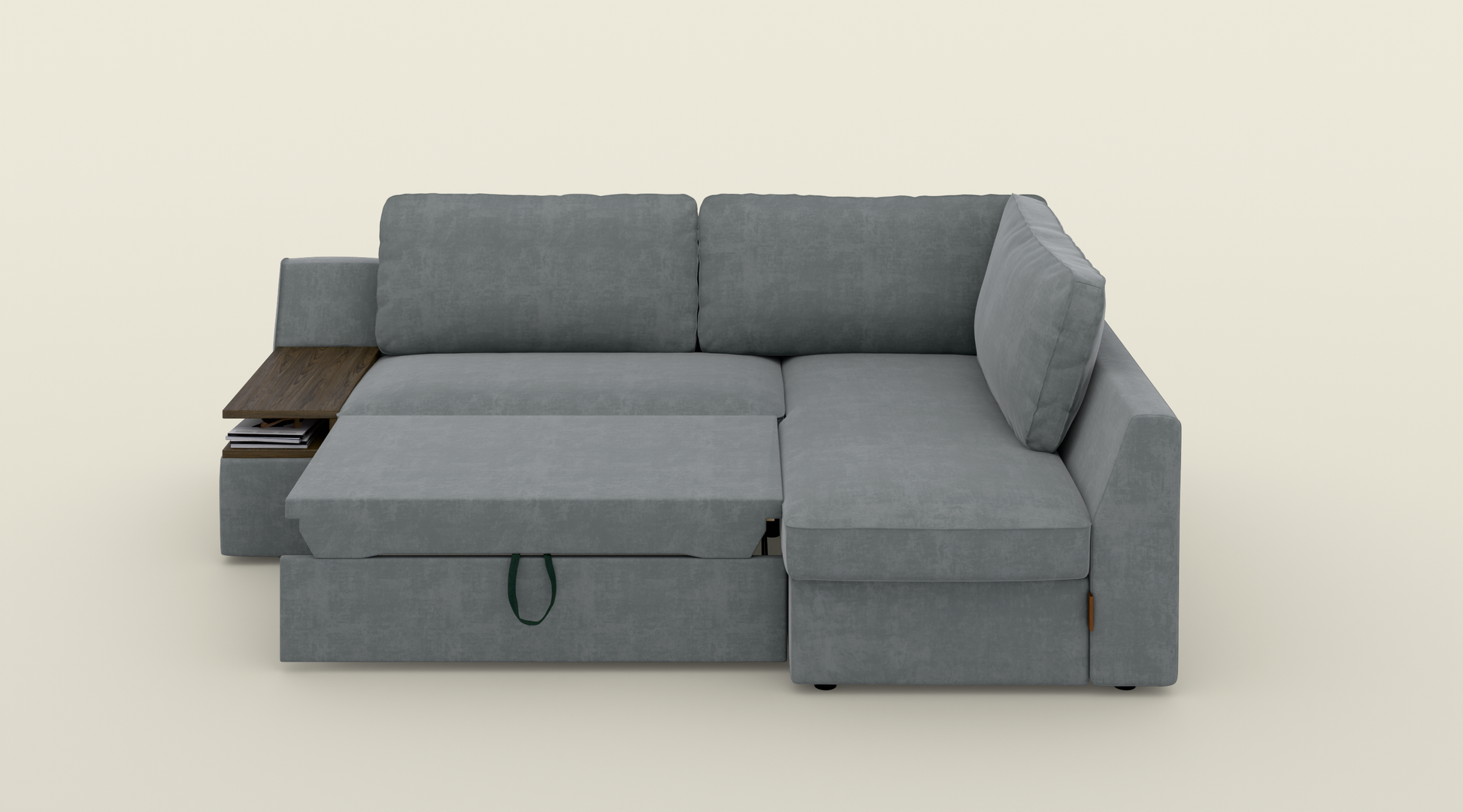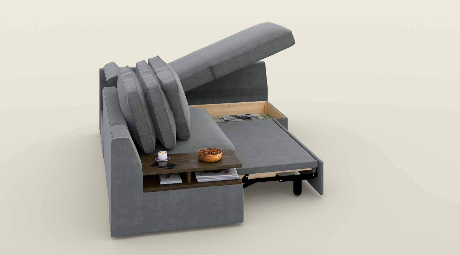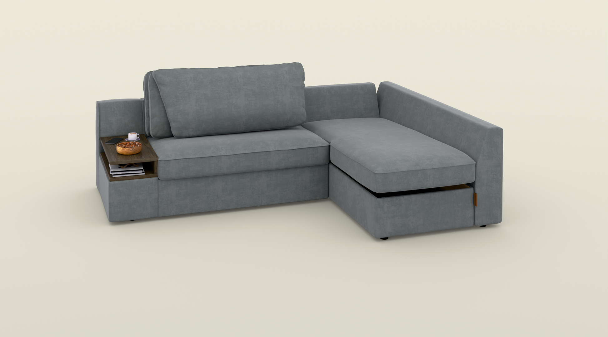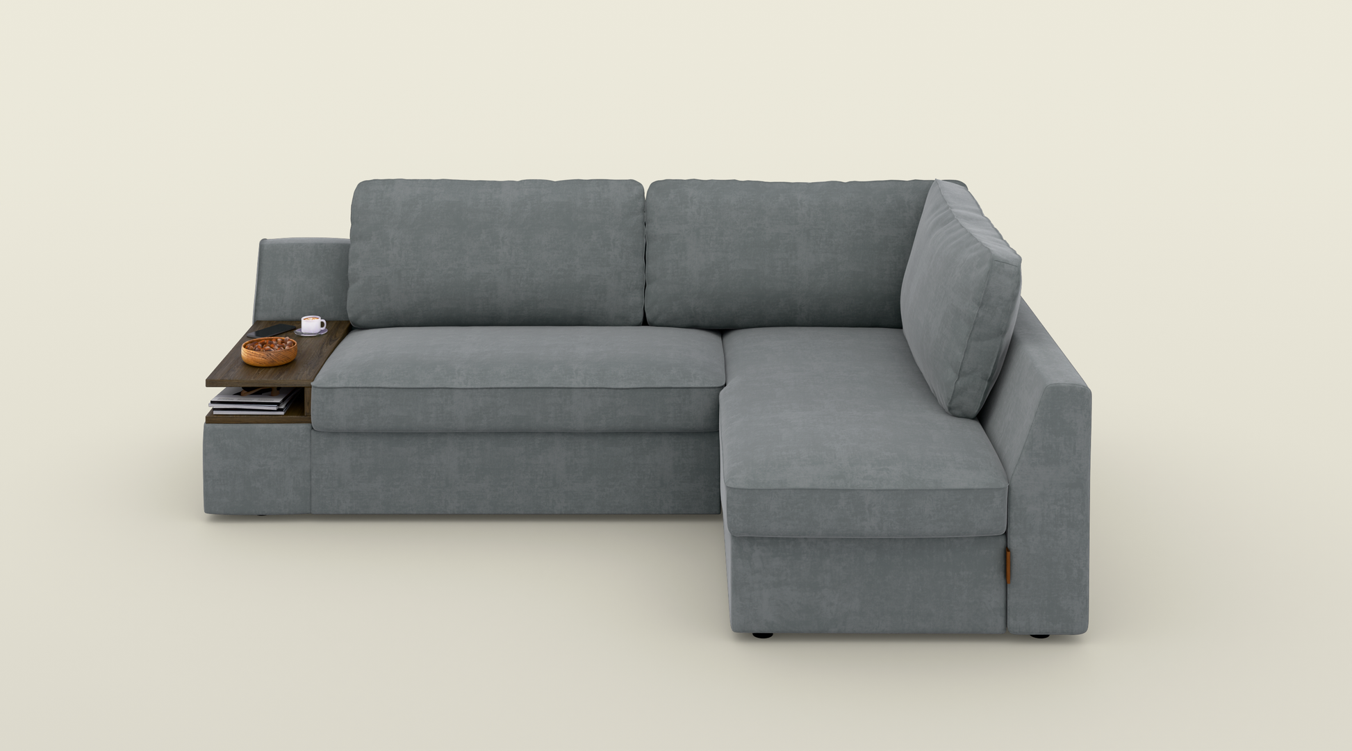 Narożnik z funkcją spania o wymiarze 245 cm to idealne połączenie komfortu i praktyczności. Duża powierzchnia zapewnia wygodne miejsce do relaksu, a miękkie poduszki otulą Cię wyjątkowym komfortem. Ten narożnik z funkcją spania posiada praktyczne rozwiązania – specjalne miejsce na kubek i telefon oraz wbudowaną półkę na książki, dzięki czemu masz wszystko pod ręką. Pokryty wysokiej jakości, wytrzymałą tkaniną odporną na przetarcia i uszkodzenia, jest łatwy w utrzymaniu i na długo zachowa swój elegancki wygląd.