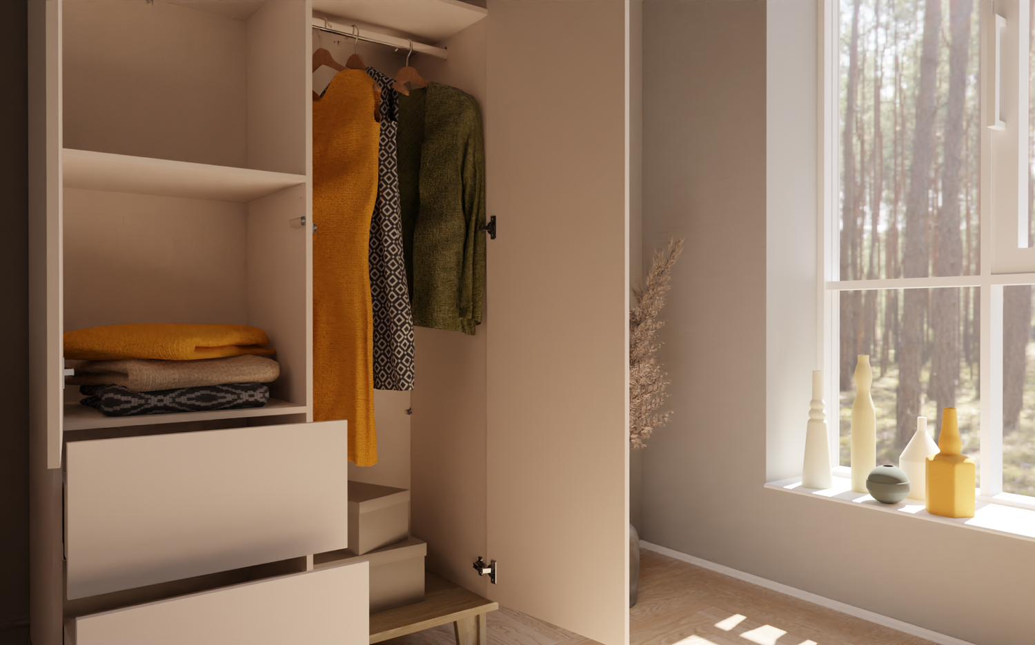 Przemyślany układ półek i przestronnych wnętrz sprawia, że szafa tapicerowana Beluro jest idealnym rozwiązaniem do sypialni, garderoby czy pokoju gościnnego, łącząc funkcjonalność z eleganckim akcentem dekoracyjnym.