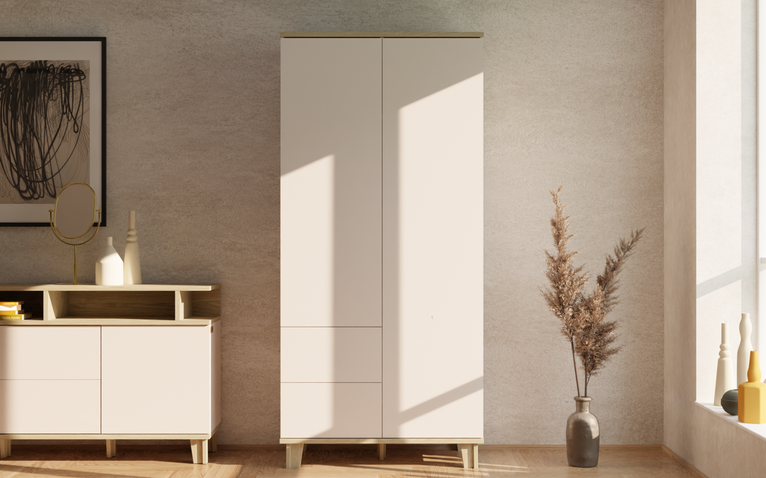 Dostępna w dwóch klasycznych kolorach – jasnym beżu i ciemnym szarym – oraz wykończona detalami w dębie olejowanym lub ciemnym dębie, szafa wyróżnia się nowoczesnym charakterem. Tkanina jest łatwoczyszcząca, hydrofobowa i odporna na plamy oraz zaciągnięcia, co gwarantuje trwałość i wygodę użytkowania na lata.