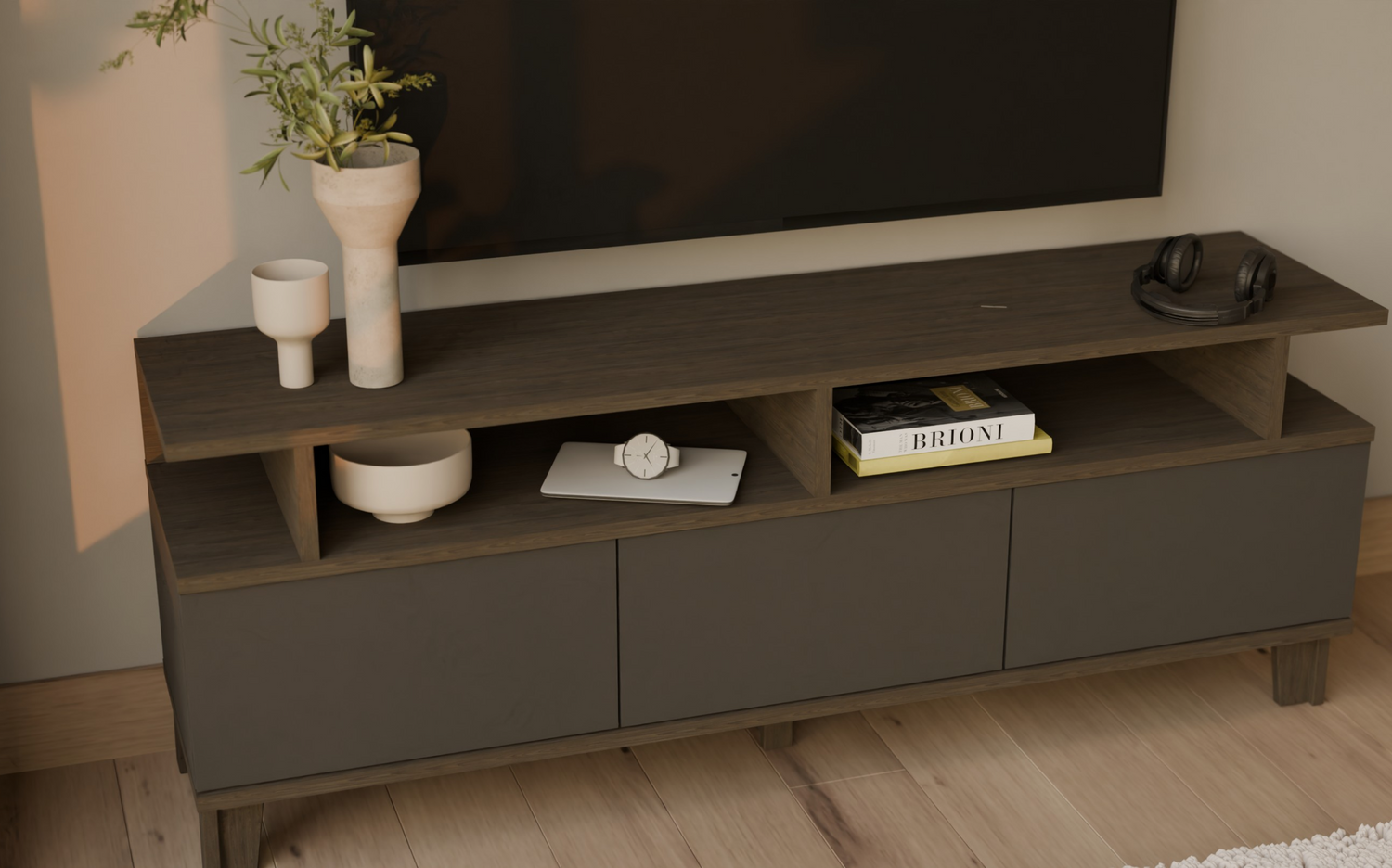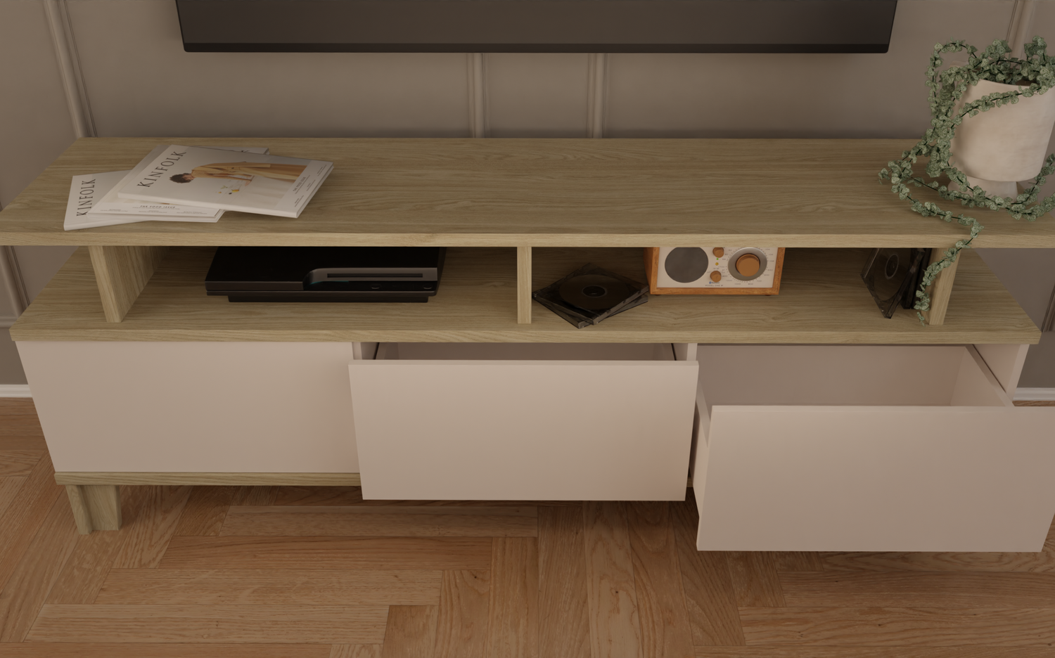 Praktyczne półki i szuflady umożliwiają wygodne przechowywanie sprzętu i akcesoriów, a tapicerowany front nadaje salonowi elegancki, spójny charakter.