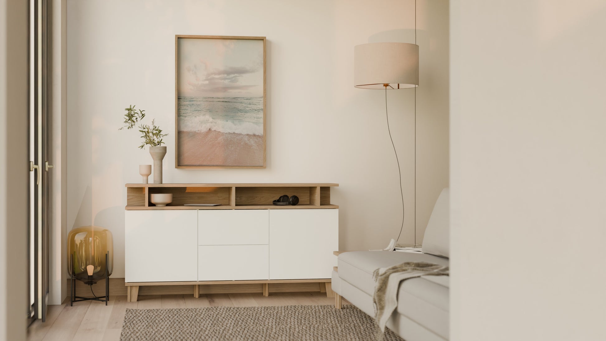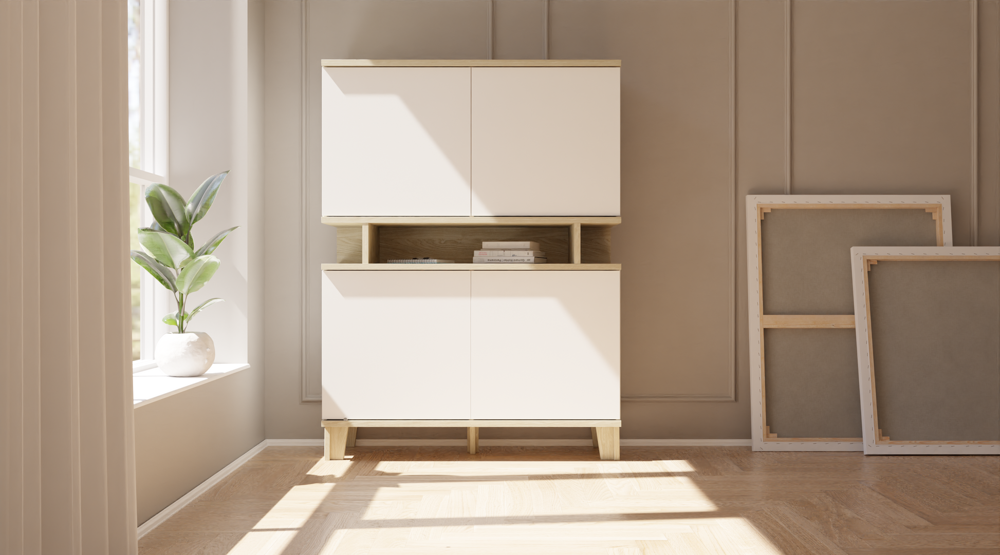 Komoda dwudrzwiowa z dwoma szufladami (dąb olejowany / biały połysk) + Komoda wysoka (dąb olejowany / biały połysk) + Stolik kawowy z podnoszonym blatem (dąb olejowany) + Sofa trzyosobowa (jasny beż / dąb olejowany) + Mała pufa (jasny beż / dąb olejowany)